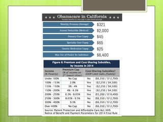 The Affordable Care Act, also known as Obamacare, was established on March 23, 2010 under President Barack Obama. It aims to expand access to affordable health insurance by opening state-run health insurance exchanges. While intended to increase access to healthcare, Obamacare remains controversial with Democrats generally supporting it and Republicans opposing it. Over the next ten years, the program is expected to cost the government $1.1 trillion but reduce the federal deficit by $200 billion.