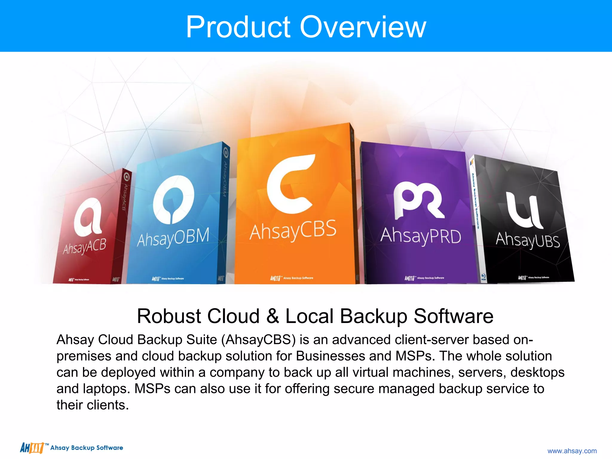 Ahsay provides a centralized cloud backup solution for businesses and managed service providers (MSPs) through its Ahsay Cloud Backup Suite (AhsayCBS), which enables comprehensive backups of virtual machines, servers, desktops, and laptops. The software offers features such as real-time monitoring, flexible destination management, and support for various backup destinations, including cloud storage and local devices. With options for scalability, user management, and reseller support, Ahsay caters to both small office and enterprise backup needs.