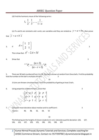 This document appears to be a past question paper for the AHSEC Commerce Stream exam. It contains 18 questions testing concepts in commercial mathematics and statistics. The questions cover topics such as sets, matrices, probability, correlation, and formulas for simple interest, compound interest, mean, standard deviation, and more. The document provides the full marks and passing marks for the exam, as well as instructions for answering the questions.