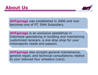 AHTgarage is an exclusive motorsports workshop in Indonesia that specializes in customizing racecars. It offers maintenance, repair, and technical consultation services. The workshop is usually occupied with racecars from various brands. AHTgarage participates in racing events at Sentul International Circuit and promotes its business through social media and its website. It works with several racers and offers marketing partnerships with multiple categories that provide branding exposure through placements on vehicles and at events in exchange for sponsorship funds.