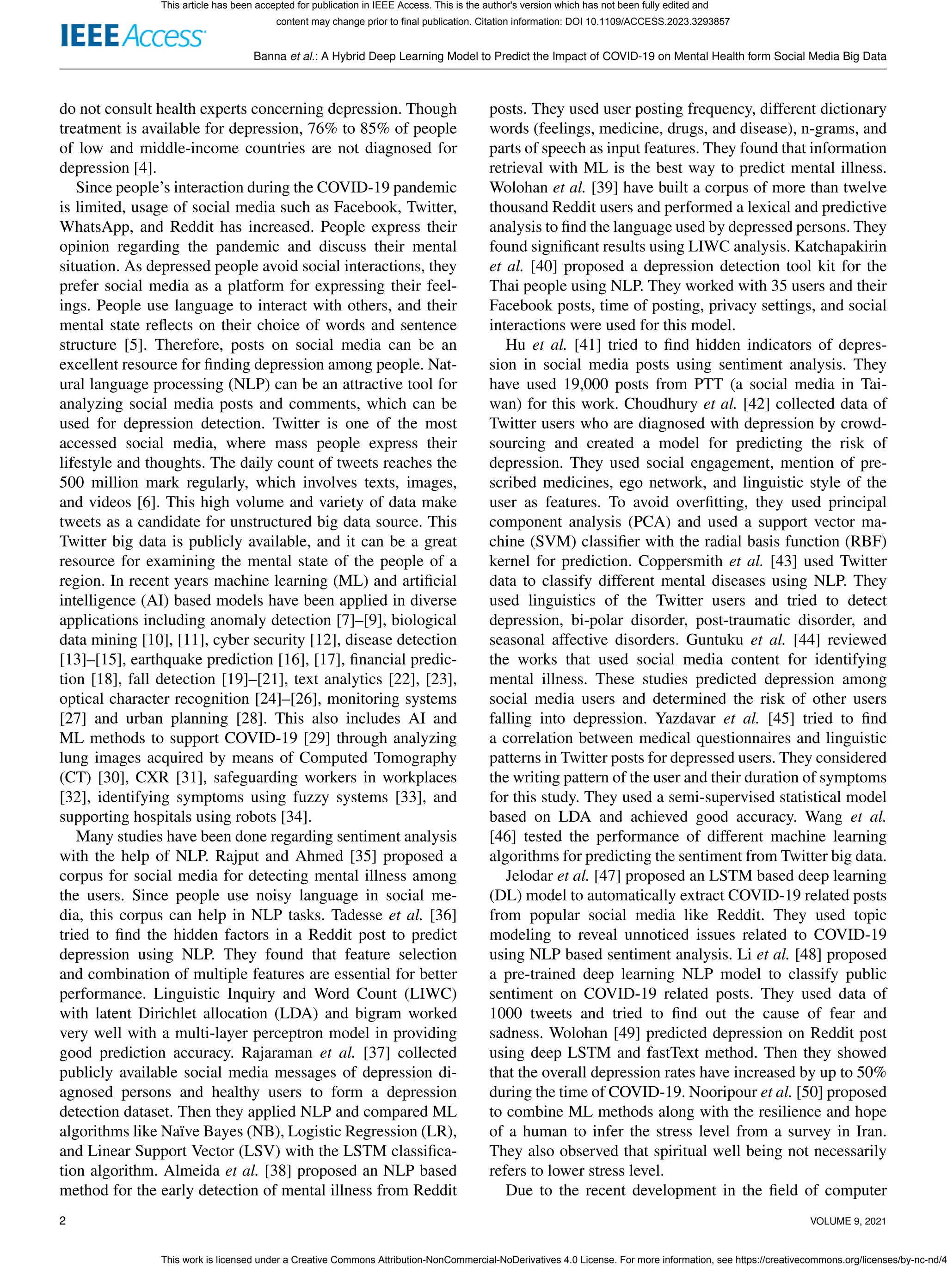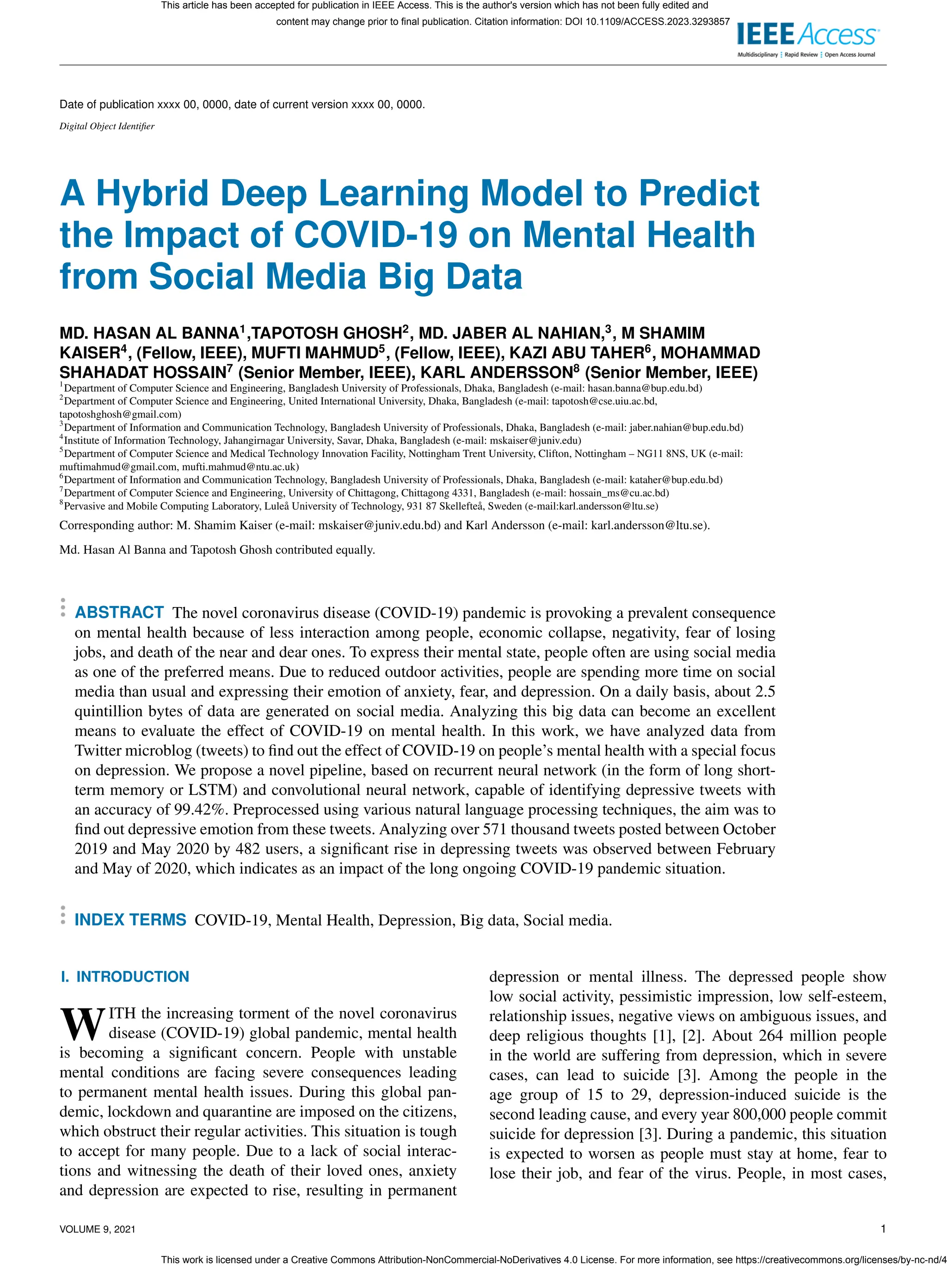 This document discusses a hybrid deep learning model utilizing LSTM and CNN to analyze social media data, particularly Twitter, to predict the impact of COVID-19 on mental health, especially depression. It highlights the increased use of social media for expressing mental states during the pandemic, revealing a significant rise in depressive tweets from February to May 2020. The model achieved an impressive accuracy of 99.42% in identifying depressive content, showcasing how social media data can serve as a valuable resource for mental health assessment.