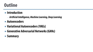 The document discusses deep generative models in artificial intelligence, focusing on techniques such as autoencoders, variational autoencoders (VAEs), and generative adversarial networks (GANs). It explains the concepts of supervised and unsupervised learning, generative modeling, and the purpose of latent variables in creating representations of data. Key insights include understanding how these models learn from data to generate new samples and improve their performance in various applications.