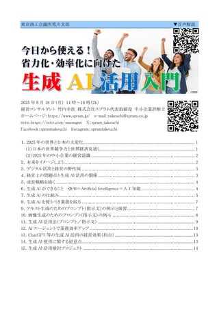8 月 18 日(月) 14 時~16 時(2h) 経営コンサルタント 竹内幸次 株式会社スプラム代表取締役 中小企業診断士 ホームページ:https://www.spram.jp/ e-mail:takeuchi@spram.co.jp note:https://note.com/smemgmt X:spram_takeuchi Facebook:spramtakeuchi Instagram:spramtakeuchi 1.2025 年の世界と日本の大変化.................................................................................... 1 (1)日本の世界競争力と世界経済見通し....................................................................... 1 (2)2025 年の中小企業の経営認識 .............................................................................. 2 2.未来をイメージしよう................................................................................................... 2 3.デジタル活用と経営の野性味 ..................................................................................... 3 4.経営上の問題点と生成 AI 活用の関係......................................................................... 3 5.成長戦略を描く......................................................................................................... 4 6.生成 AI ができること ※AI=Artificial Intelligence=人工知能 ........................................ 4 7.生成 AI の仕組み...................................................................................................... 5 8.生成 AI を使うべき業務を絞る ..................................................................................... 7 9.テキスト生成のためのプロンプト(指示文)の例示と演習................................................... 7 10.画像生成のためのプロンプト(指示文)の例示 .............................................................. 8 11.生成 AI 活用法(プロンプト/指示文) ......................................................................... 9 12.AI エージェントで業務効率アップ ..............................................................................10 13.ChatGPT 等の生成 AI 活用の経営効果(利点) ...........................................................13 14.生成 AI 使用に関する留意点....................................................................................13 15.生成 AI 活用検討プロジェクト ...................................................................................14