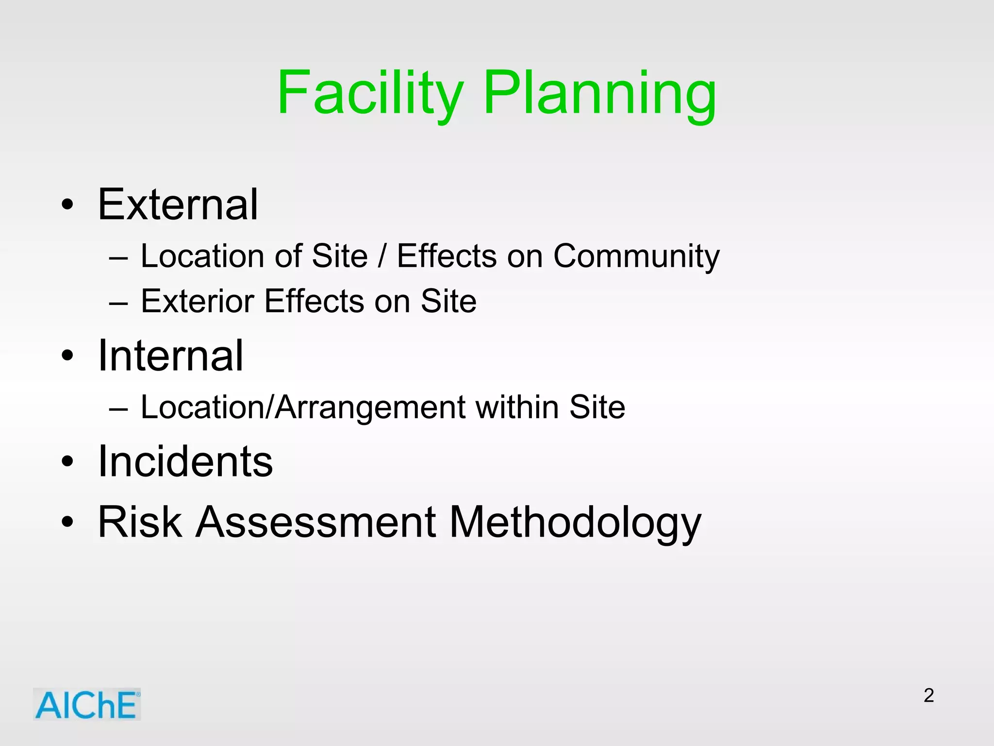 The document discusses the importance of facility planning and siting to prevent incidents and minimize risks. It outlines factors to consider for external and internal site location, including effects on the community, environment and operations. Examples of major chemical plant incidents are provided, demonstrating consequences of fires, explosions and toxic releases. The planning process involves risk assessments of hazards, controls to reduce risk, and following industry standards.