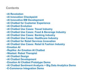 The document discusses the evolution and applications of AI chatbots across various industries including travel, food and beverage, banking, healthcare, and retail, highlighting their role in improving customer experience through immediate, personalized responses. It covers the technical aspects of AI chatbots, such as natural language processing and emotion AI, which enhances their ability to understand and respond to human emotions. Additionally, it includes case studies of successful chatbot implementations by brands like Uniqlo, Sephora, and Whole Foods.