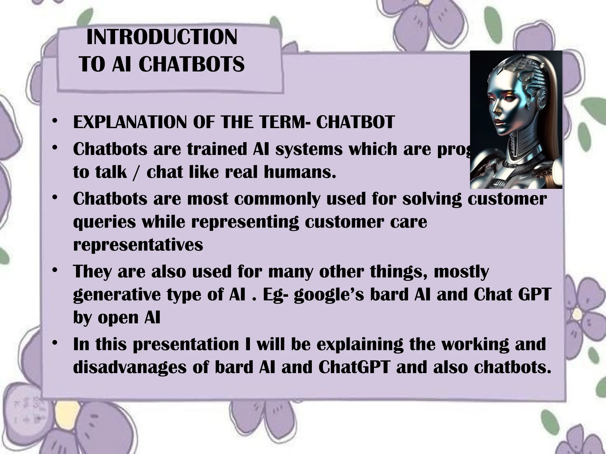 The document discusses AI chatbots, specifically comparing Google's Bard AI and OpenAI's ChatGPT, detailing their functionalities, advantages, and disadvantages. While Bard AI is noted for its conversational ability and up-to-date responses, it lacks real-world common sense, whereas ChatGPT excels in natural language processing but can generate biased or outdated information. Both chatbots have significantly improved customer support efficiency but come with concerns regarding job displacement and limitations in understanding.