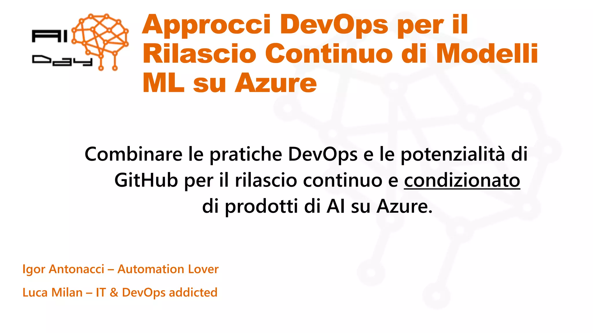 The document discusses the integration of DevOps practices and GitHub capabilities for continuous and conditional deployment of AI products on Azure, with a focus on machine learning (ML) operationalization (MLOps). Key objectives include enhancing collaboration between data scientists and IT operations while automating the model development lifecycle. It outlines a solution architecture that features automated pipelines for model training, testing, and deployment, utilizing tools like GitHub Actions and Pulumi.