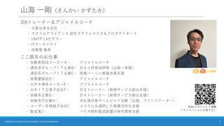 自動車部品メーカーA: アジャイルコーチ ◦ 通信系グループIT企業B: DX人材育成研修(企画~実施) ◦ 通信系グループIT企業C: 営業パーソン意識改革支援 ◦ 家電量販店D: アジャイルコーチ ◦ 大手半導体メーカーE: アジャイルコーチ ◦ 大手IT企業子会社F: DXトレーナー(新規サービス創出支援) ◦ 金融系企業G: DXトレーナー(新規サービス創出支援) ◦ 金融系IT企業H: 全社員対象チームビルド活動(企画、ファシリテーター) ◦ ユーザー系情報子会社I スクラムを適用した現場活性化支援 ◦ 製造業J: バイオ燃料製造装置の研究開発支援 ◦ 大阪出身&在住 ◦ スクラムアライアンス 認定スクラムマスタ&プロダクトオーナ ◦ UMTP L4モデラー ◦ ITアーキテクト ◦ 改善塾 塾長 DXトレーナー&アジャイルコーチ Webマガジンにて連載 「イノベーションの育て方」 2 COPYRIGHT © 2025 KAZUTAKA SANKAI. ALL RIGHTS RESERVED.