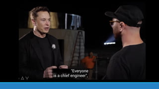 30 Elon Musk は、多くのエンジニアが協働することについて、よくビデ オゲームの比喩を使います。例えば「子供がマインクラフトで遊ぶ 時に、マインクラフトのやり方を教えたり、指示したりするかい? 君たちの仕事もマインクラフトみたいになるべきなんだよ」 COPYRIGHT
