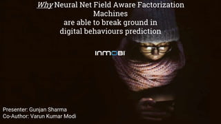 This document discusses neural net field aware factorization machines (NFFM) for predicting digital behaviors. It begins by introducing the presenters and their backgrounds. It then outlines the problem of predicting conversion ratios (CVR) and video completion rates (VCR), and why these are important. Existing models like logistic regression and tree-based models are described along with their limitations. The document then motivates the use of neural nets to find higher-order interactions and details the challenges involved. It proceeds to introduce factorization machines (FM) and field aware FM (FFM) as models, and then introduces deep neural net models like DeepFM, NFM, DeepFFM, and the proposed NFFM model. Results show NFF