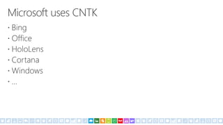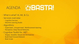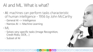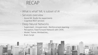 Damir Dobric is a lead software architect at daenet GmbH and a Microsoft Regional Director and Most Valuable Professional. The document provides links to resources about AI for .NET developers including links to tutorials on machine learning using Azure Machine Learning, CNTK, and ONNX. It also includes a code sample of a simple neural network model and links to documentation for CNTK and GitHub repositories containing additional samples.