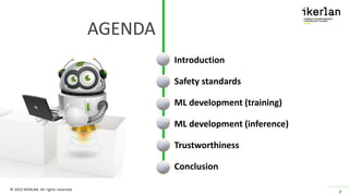 The document discusses the integration of artificial intelligence (AI) and machine learning (ML) into safety-critical systems, focusing on the development and certification standards needed for ensuring their safety. It highlights various safety standards drafts, such as ISO/PAS 21448 and UL 4600, which aim to address the challenges associated with AI in autonomous systems. The conclusion emphasizes the necessity for defining supplementary AI safety standards alongside traditional functional safety measures to tackle issues such as training data coverage and trustworthiness.