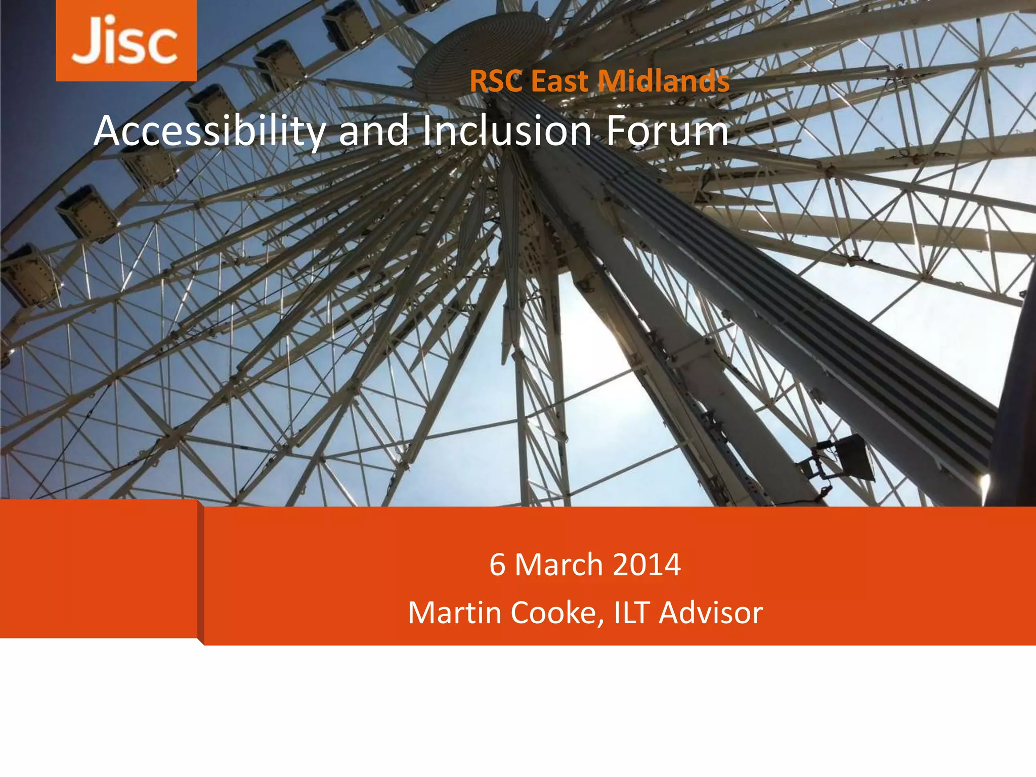This document summarizes an accessibility and inclusion forum hosted by the RSC East Midlands on March 6, 2014. It provides an agenda for the event including presentations and discussions on topics like the Children and Families Bill, accessibility tools and apps, open badges, and using technology to support transitioning students. Upcoming conferences and resources on inclusive learning and the post-16 code of practice for students with learning difficulties and disabilities are also advertised.