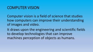 Computer vision is a field of artificial intelligence that uses computer algorithms to analyze and understand digital images. It draws on engineering and science to develop technologies that can improve how machines perceive objects like humans. Computer vision has applications in self-driving cars, facial recognition, health technologies, and more. It works by training computer systems on large datasets of images to recognize patterns and classify objects.