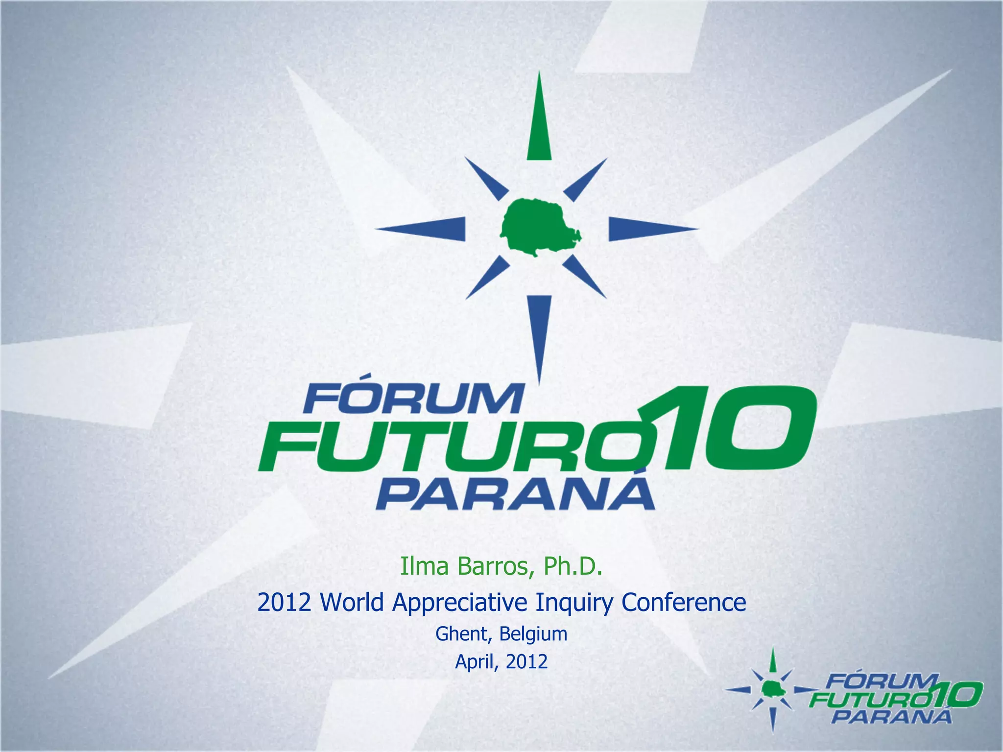 The document summarizes a large conference called the Future 10 Parana Forum that was held in Parana, Brazil in 2005. The forum brought together over 5,000 leaders from business, government, and civil society to discuss strategic directions for developing the state over the next 10 years. Key topics discussed included health, education, tourism, and more. The forum was a success in generating ideas and gaining commitment from leaders to work together on implementing proposals to advance the state. Plans were made to continue the collaboration through a permanent development council.