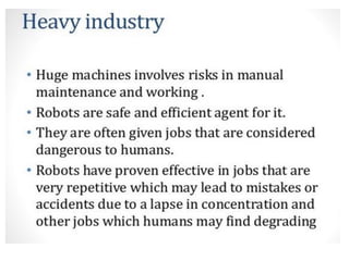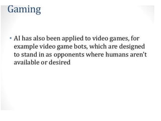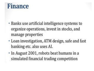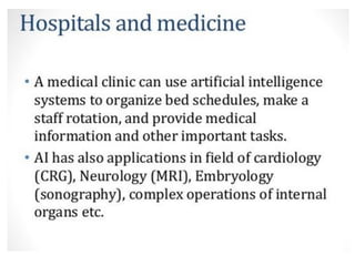 The document provides an overview of artificial intelligence (AI), defining it as the science and engineering of creating intelligent machines that can think and act like humans. It discusses the challenges AI faces, such as data privacy and the need for better understanding of human intelligence, and highlights various applications including self-driving cars, robotics, expert systems, and consumer marketing. The document underscores AI's potential in solving complex problems across diverse fields while also recognizing that many challenges remain to be addressed.