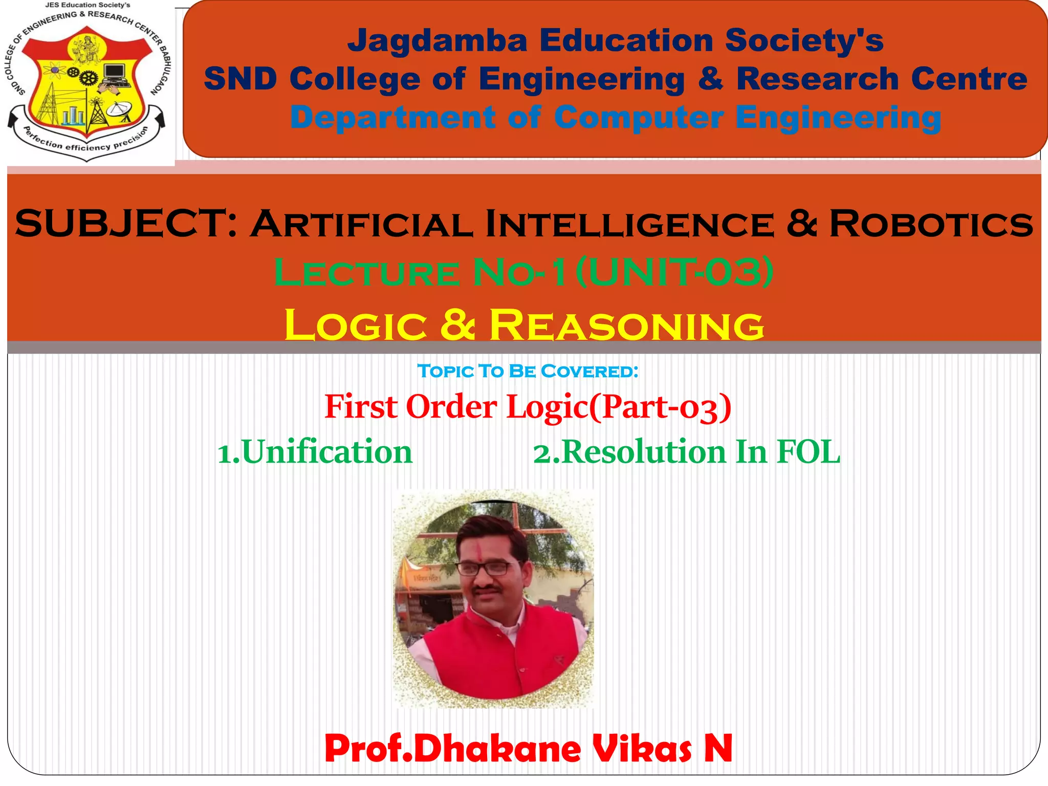 This document explains unification and resolution in first-order logic (FOL) as part of an artificial intelligence lecture. Unification involves making two logical expressions identical through substitution, while resolution is a theorem proving technique based on refutation proofs. Key steps in resolution include converting facts to FOL, transforming them into conjunctive normal form (CNF), and using unification to derive resolvents.