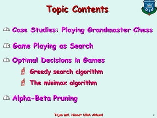 This document discusses game playing as an area of artificial intelligence research. It provides examples of how search algorithms like minimax and alpha-beta pruning have been used to develop computer programs that can play games like chess at a grandmaster level. Specifically, it mentions how IBM's Deep Blue program was able to defeat world chess champion Garry Kasparov through brute force search methods combined with these algorithms. The document then provides details on minimax search and how static board evaluation functions allow searches to estimate values beyond search depths.