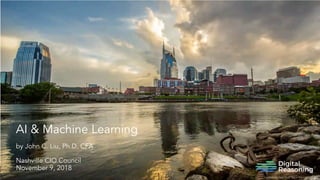The document presents insights on artificial intelligence (AI) and machine learning (ML) from John C. Liu, highlighting their roles in various sectors like healthcare, banking, and retail. It discusses projected spending growth in AI, which is expected to reach $52.2 billion by 2021, and identifies key applications and innovations driven by data and cloud computing. The information is presented for educational purposes and should not be used as investment advice.