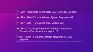 This document provides biographical information about Şaban Dalaman and summaries of key concepts in artificial intelligence and machine learning. It summarizes Şaban Dalaman's educational and professional background, then discusses Alan Turing's universal machine concept, the 1956 Dartmouth workshop proposal that helped define the field of AI, and definitions of AI, machine learning, deep learning, and data science. It also lists different tribes and algorithms within machine learning.