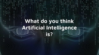 The document discusses artificial intelligence (AI) and provides examples of current AI applications. It defines AI as the development of computer systems that can perform tasks requiring human intelligence, such as visual perception and language translation. Examples of current AI include self-driving cars, robotics, navigation systems, and chatbots. Weak AI is designed for specific tasks while strong AI would think and act like humans, but no systems have achieved strong AI yet. The document also discusses machine learning, the Turing test for measuring intelligence, and potential future applications of AI in fields like the military, law, business, healthcare, and more.