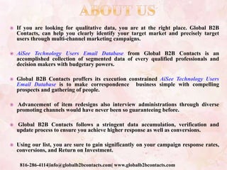Global B2B Contacts provides a comprehensive Aisee technology users email database aimed at helping businesses identify and target their ideal market through multi-channel marketing campaigns. The database includes segmented data on qualified professionals and decision-makers, ensuring high response rates and ROI for marketing efforts. Their processes prioritize data accuracy and completeness, offering rich marketing information to improve campaign effectiveness.