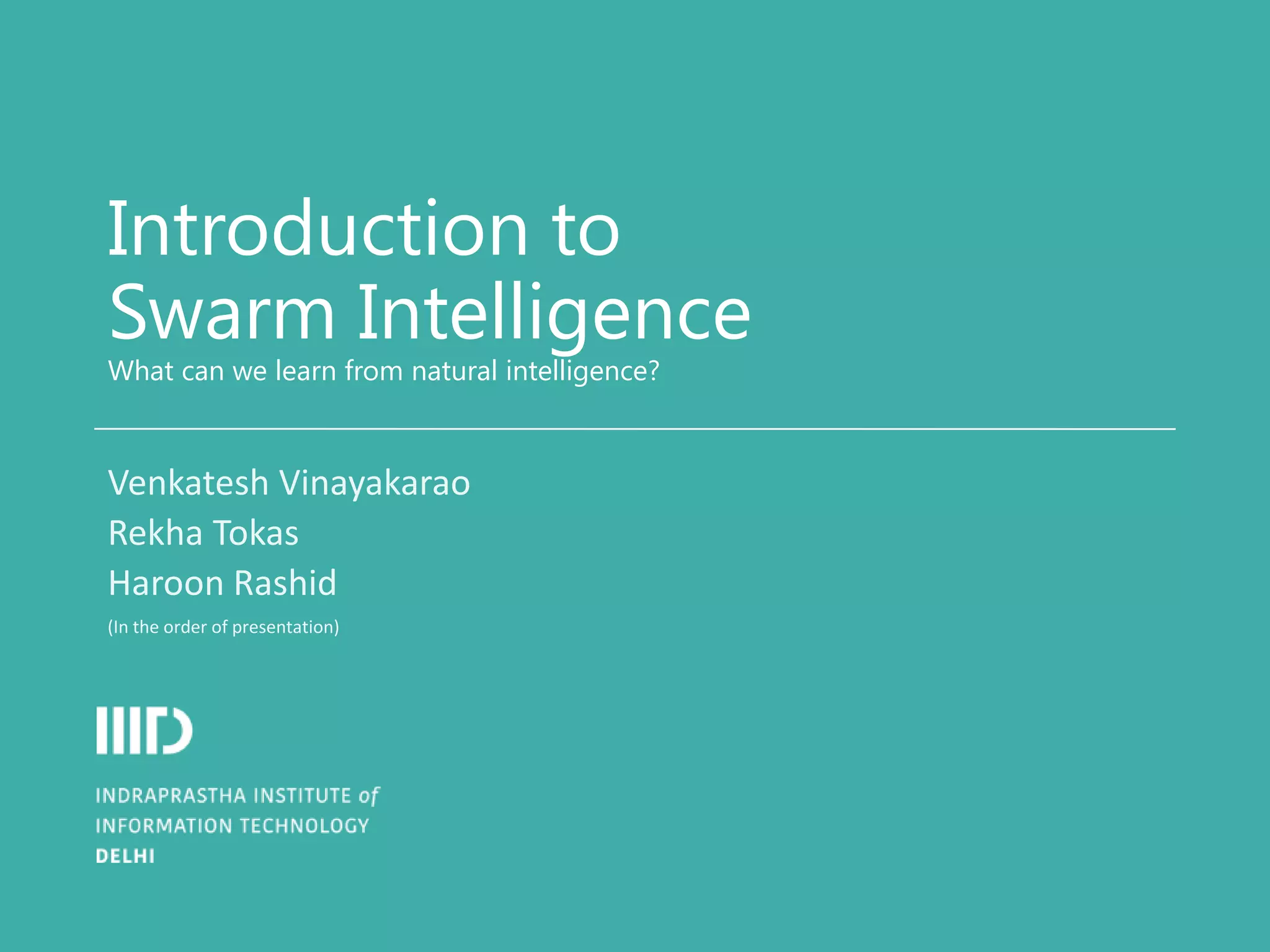 The document introduces swarm intelligence, highlighting its concepts such as stigmergy and self-organization, which are inspired by the behavior of social insects like ants and termites. It discusses algorithms such as ant colony optimization and particle swarm optimization, as well as various applications in fields like telecommunications and military technology. It also addresses the strengths and limitations of swarm intelligence, concluding that mimicking natural systems can lead to effective problem-solving strategies.
