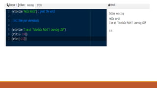 - LISP uses prefix notation and parentheses extensively. Functions are applied using (func arg1 arg2).