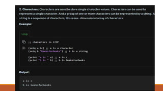 This document provides an overview of the LISP programming language. It discusses LISP syntax, data types, functions, predicates, conditionals, variables, and other core concepts. Some key points: