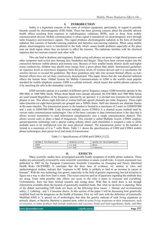 This document summarizes research on the effects of mobile phone radiation on human health. It discusses two main mobile phone technologies (GSM and CDMA) and their different operating frequencies and power levels. Studies show that GSM radiation has a larger effect on the brain than CDMA, as measured by electroencephalograms of volunteers. While some studies link mobile phone radiation to health issues like genetic damage and tumors, the evidence is still inconclusive. More research is still needed to understand potential long-term risks of heavy mobile phone use.