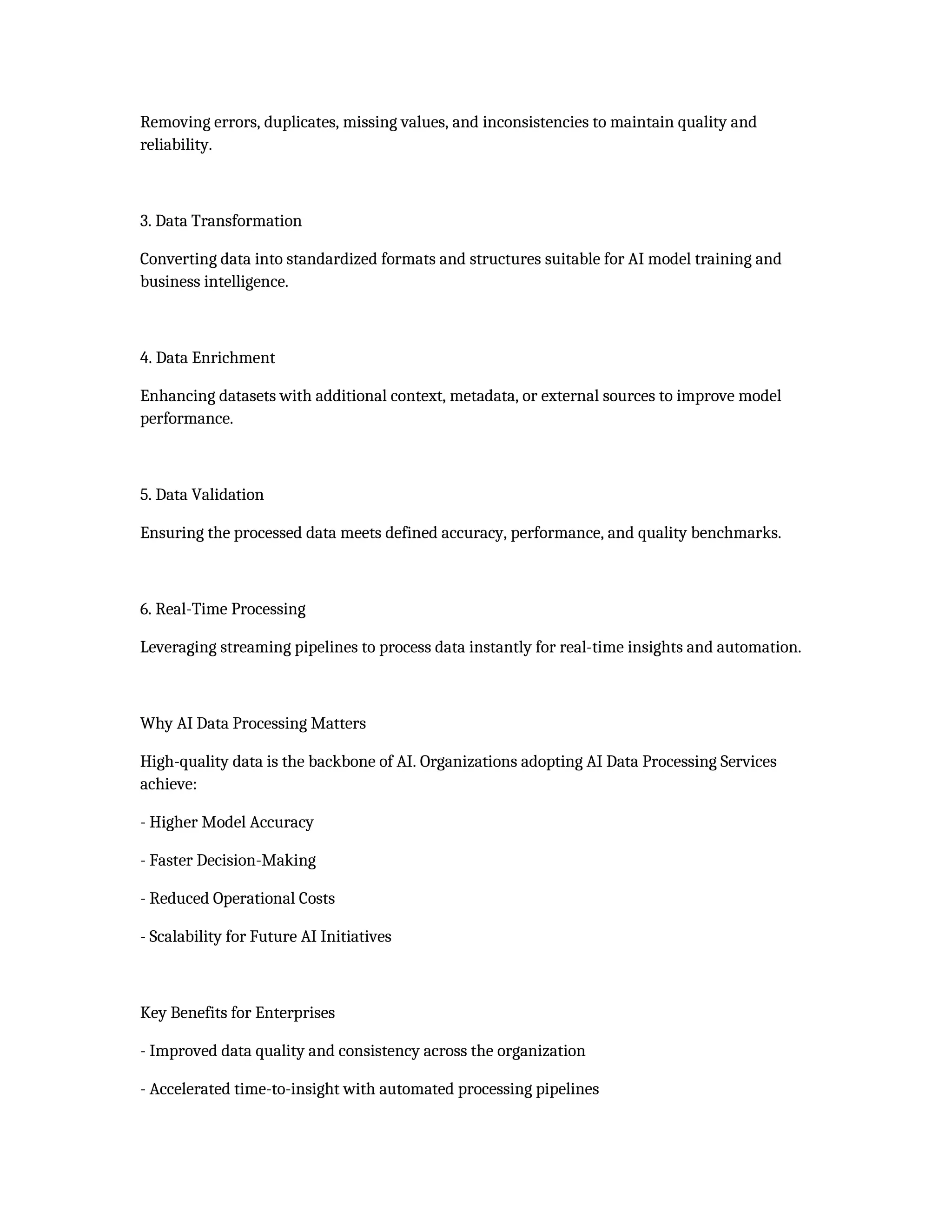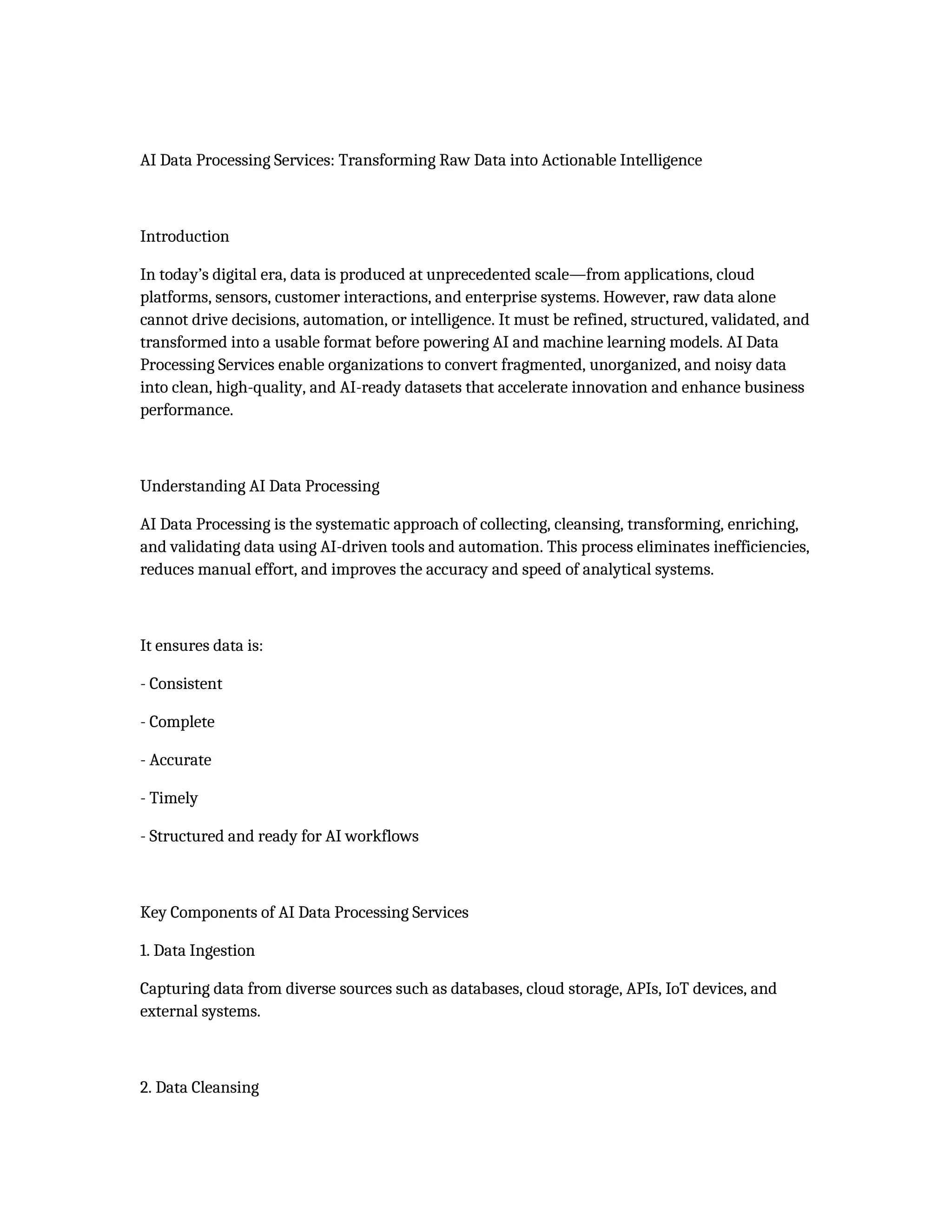AI Data Processing Services enable organizations to convert fragmented, unorganized, and noisy data into clean, high-quality, and AI-ready datasets that accelerate innovation and enhance business performance.