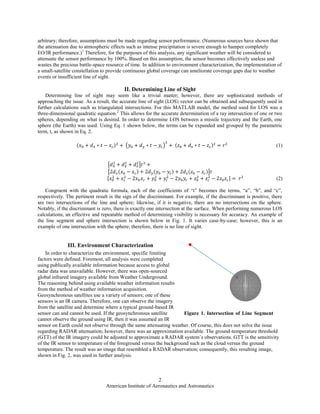 The document discusses methods for characterizing the global environment using satellite data to help overcome challenges posed by weather effects on missile defense sensors. It describes adjusting infrared imagery thresholds to approximate radar observations, extracting weather event boundaries, projecting 3D shapes onto a model Earth, and using an existing satellite constellation to provide continuous coverage. The goal is to determine visibility and sensor performance to optimize sensor selection and placement for missile defense.