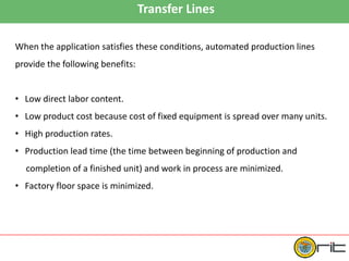 2. Transfer lines are appropriate for high production demand of parts requiring multiple operations, with stable designs and long product lives. They provide benefits like low labor costs and high production rates.