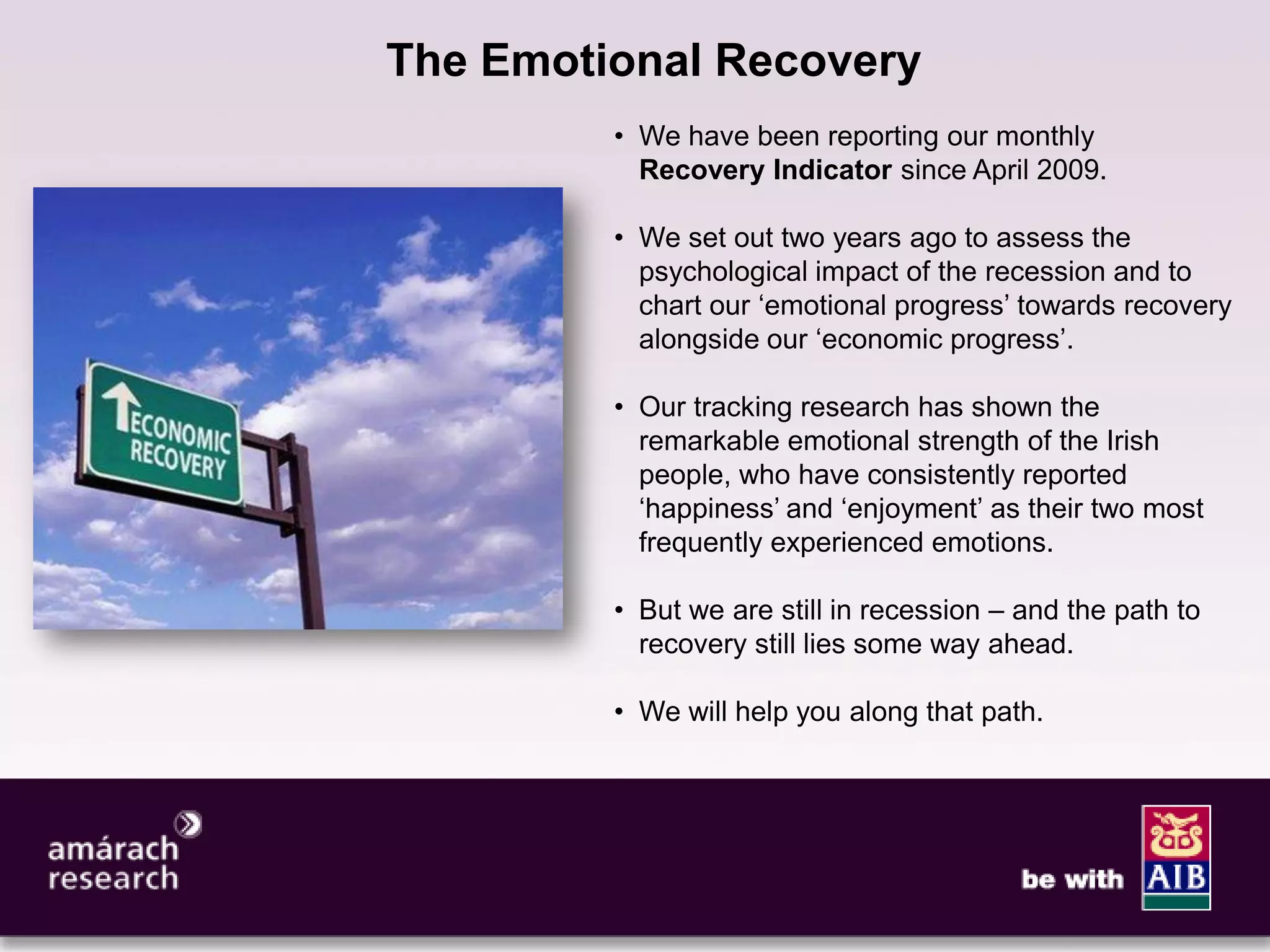The AIB-Amárach Recovery Indicator report, tracking the economic and emotional recovery in Ireland since April 2009, reveals a recovery index of 20.3 as of July 2011, showing minimal change from the previous month. Despite ongoing recessionary conditions, indicators reflect a resilient emotional state among the Irish population, with consistent reports of happiness and enjoyment. The report aims to monitor the transition out of recession and suggests that while emotional conditions are improving, tangible shifts in consumer behavior may take longer to manifest.