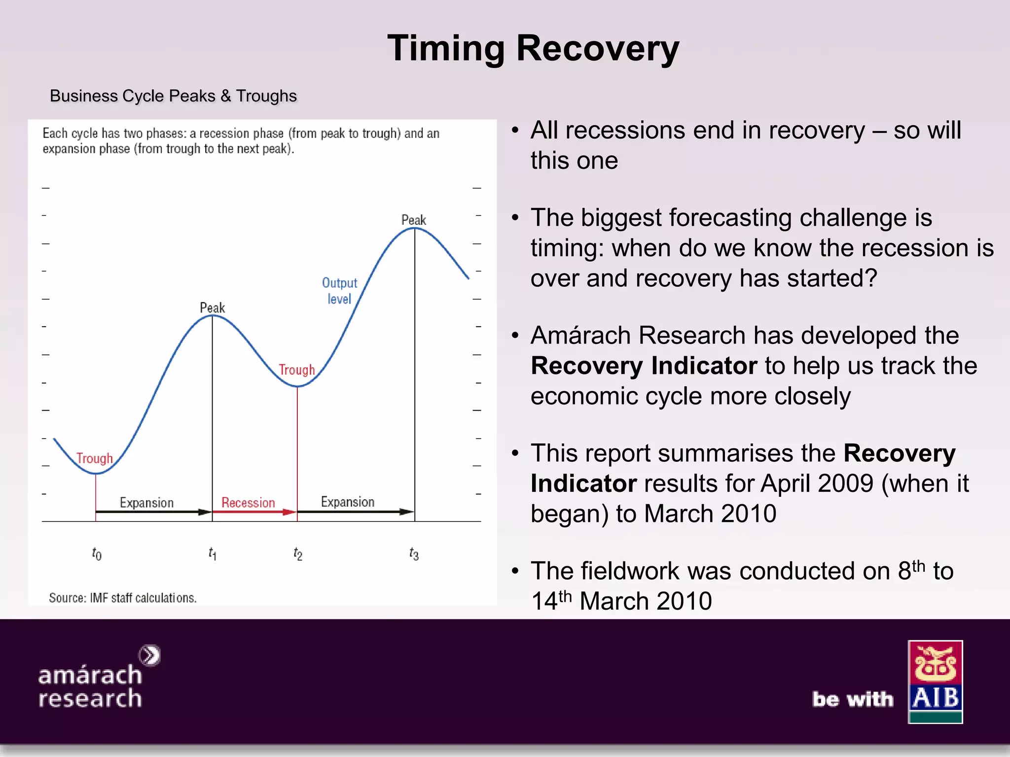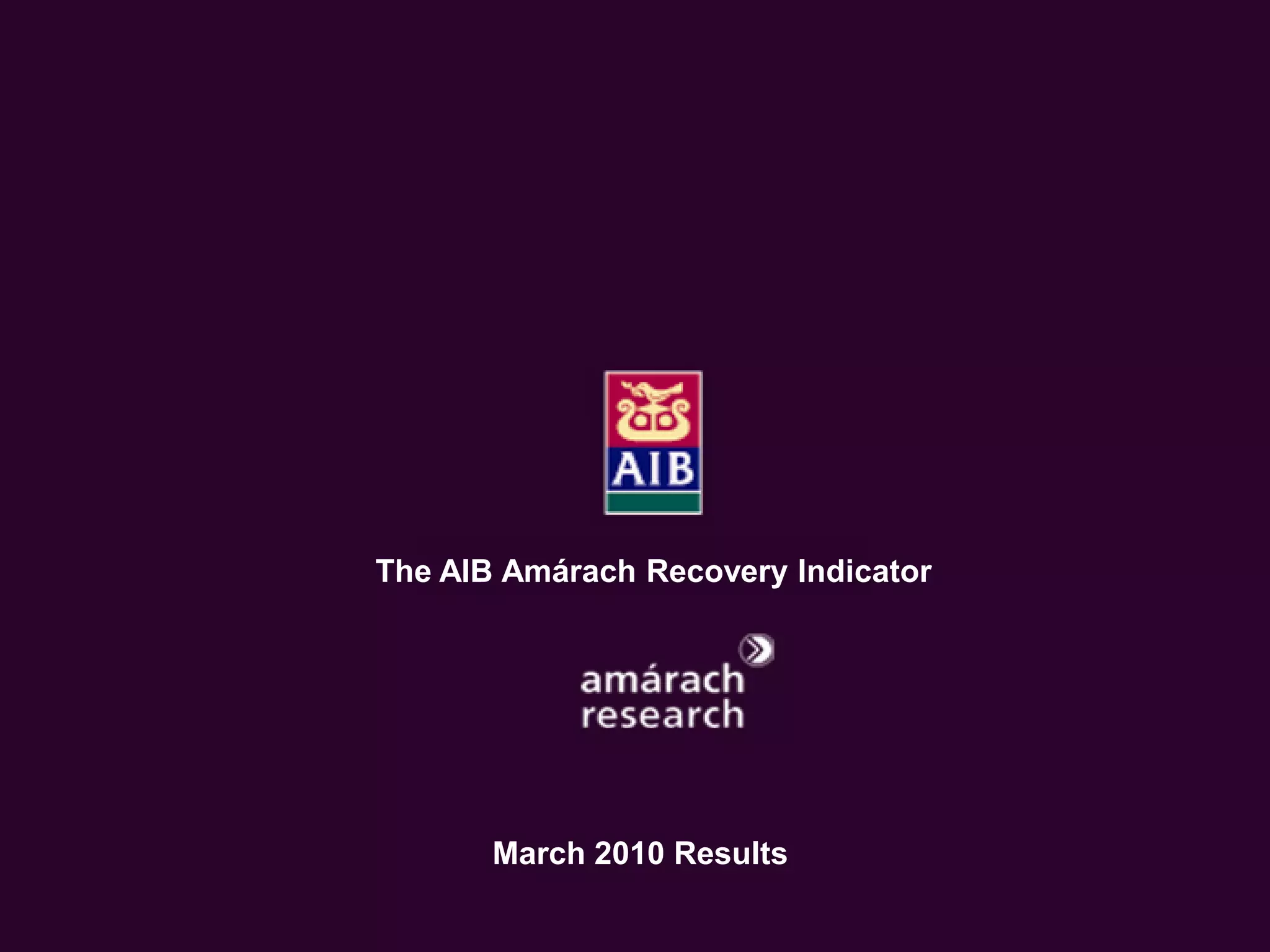 This document summarizes the results of the March 2010 AIB Amárach Recovery Indicator survey. The survey asks 1,000 Irish adults monthly to assess the economic situation. In March 2010, 36% felt the economy was bad but stable/improving, up from 1% in April 2009. The Recovery Indicator rose to 27.1 in March from 22.7 in February, showing gradual growth. Respondents were more optimistic that the recession's worst would pass in 12 months and that now is a good time to buy a house. Worry and stress declined slightly from February levels while enjoyment and happiness rose slightly.