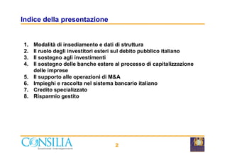 Il documento analizza il supporto delle banche estere all'economia italiana nel 2012, evidenziando il loro ruolo nel debito pubblico, negli investimenti e nelle operazioni di fusione e acquisizione. Le istituzioni estere hanno mantenuto una presenza significativa nel mercato bancario italiano e hanno contribuito allo sviluppo di diversificati settori economici, con un aumento degli investimenti. Inoltre, vengono forniti dati sulle filiali e sul personale delle banche straniere attive in Italia.
