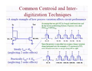 This document discusses analog integrated circuit layout techniques. It covers topics like design rules, schematic to layout translation, cross-sectional diagrams, matched components, unit component design, boundary condition matching using common centroid layout, parasitic capacitance estimation, scalable versus absolute design rules, transistor layouts including dense layouts, reducing parasitic capacitances through careful layout, capacitor and resistor layouts, handling mismatches, and inter-digitization to reduce errors from overetching. Layouts of basic components like NAND gates and MOS transistors are also shown.