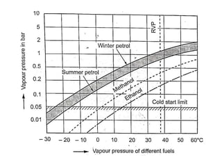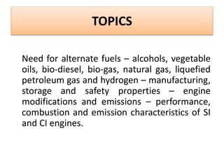 The document discusses various alternative fuels to gasoline and diesel, including alcohols (methanol and ethanol), vegetable oils, biodiesel, natural gas (compressed and liquefied) and liquefied petroleum gas. It describes the need for alternative fuels due to depletion of conventional fuels and to reduce pollution and global warming. The production processes of various fuels are explained along with their properties, advantages, and disadvantages when used in spark ignition or compression ignition engines. Modifications required in engines to use alternative fuels are also mentioned.