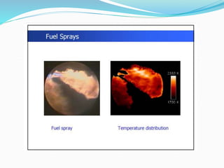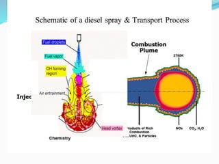 The document discusses diesel fuel injection systems and combustion in compression ignition engines. It covers the stages of combustion (ignition lag, rapid combustion, controlled combustion, after burning), factors that affect ignition delay and knocking, different combustion chamber designs (direct injection, indirect injection), fuel spray behavior, and the role of air motion within the cylinder. Turbocharging is introduced as a way to compress more air into the cylinder before fuel injection, enabling increased power output and efficiency.