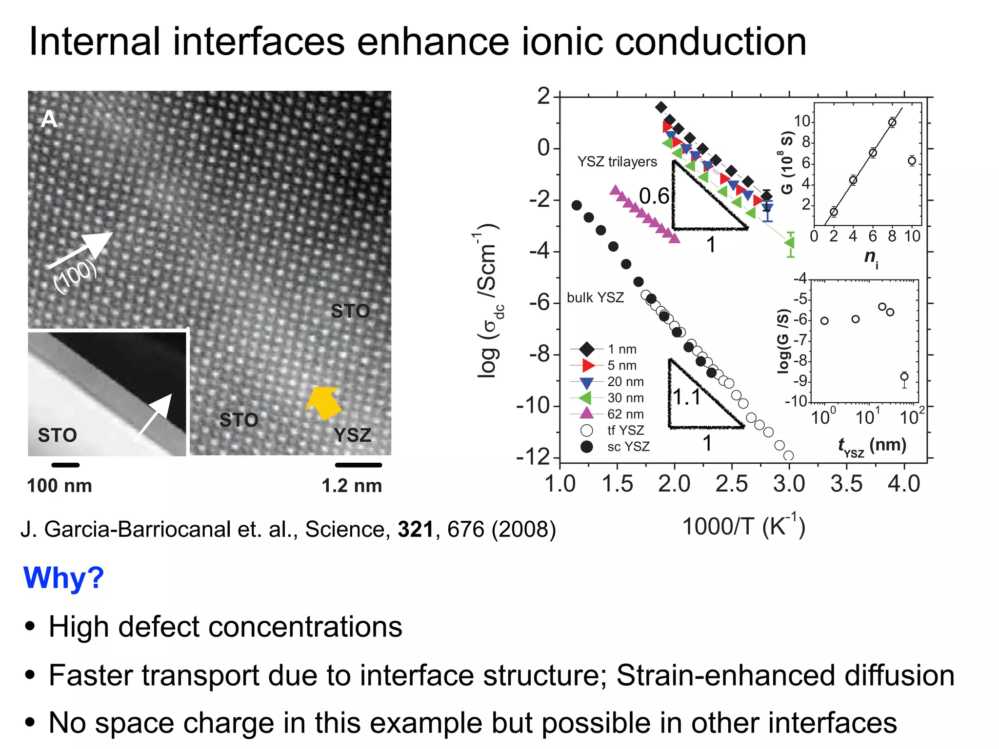 - Ionic conduction is sensitive to interface structure, with interfaces enhancing ionic conduction due to high defect concentrations, strain-enhanced diffusion, and interface-modified structure (1-2 sentences)