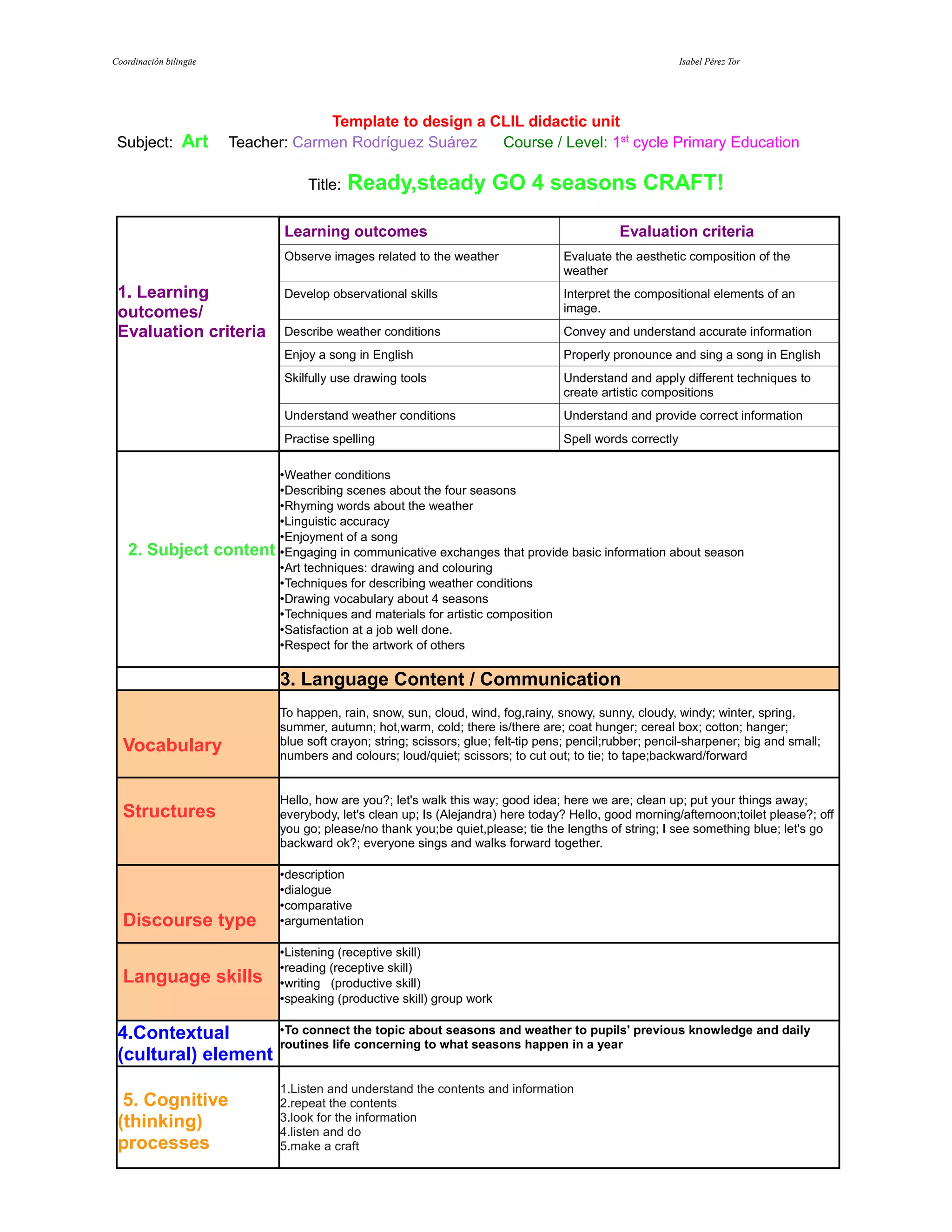 This document provides a template for designing a CLIL (Content and Language Integrated Learning) didactic unit for an art class. The unit focuses on the four seasons and weather. It includes learning outcomes, subject content, language content, contextual elements, cognitive processes, activities, methodology, resources, evaluation criteria. The unit has four 45-minute sessions over two weeks where students will learn vocabulary, sing songs, craft projects, and create a virtual museum blog to display their work.