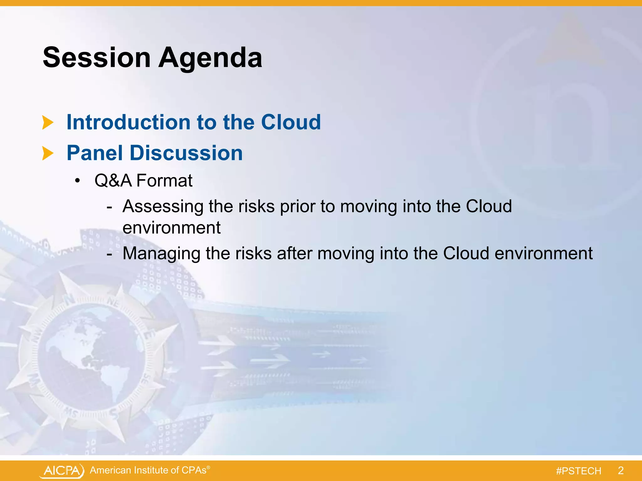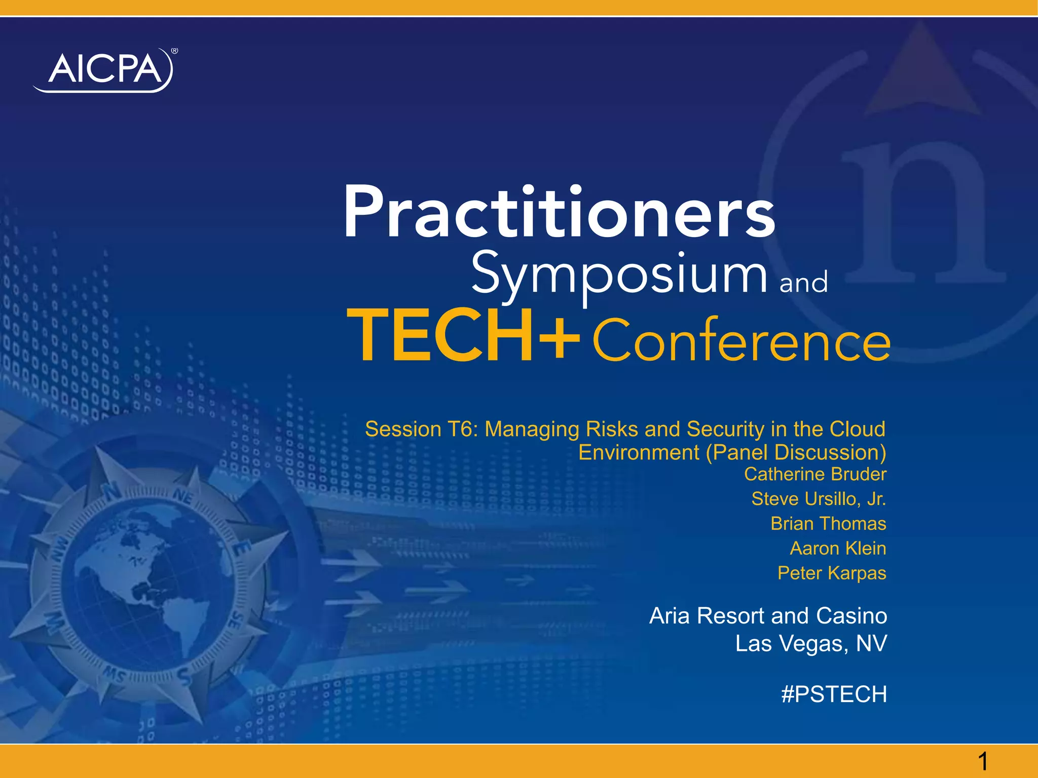 This document summarizes a panel discussion on managing risks and security in the cloud environment. The panelists include professionals from accounting firms and cloud technology companies. They discuss assessing risks prior to moving to the cloud, such as legal and compliance considerations. After moving to the cloud, topics discussed include options for mitigating risks, ensuring risks are addressed, and best practices for resource monitoring and cost controls. The document provides biographies of the panelists and information on additional resources for cloud computing and the CITP certification.