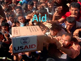 The document outlines various types of aid including non-governmental, bilateral, multilateral, emergency, and development aid, highlighting their specific characteristics and delivery methods. It discusses problems associated with aid such as miscoordination and misuse, exemplified by aid workers being taken hostage. The document also focuses on Sudan's challenges such as rapid population growth, resource strain, and prolonged civil conflict.