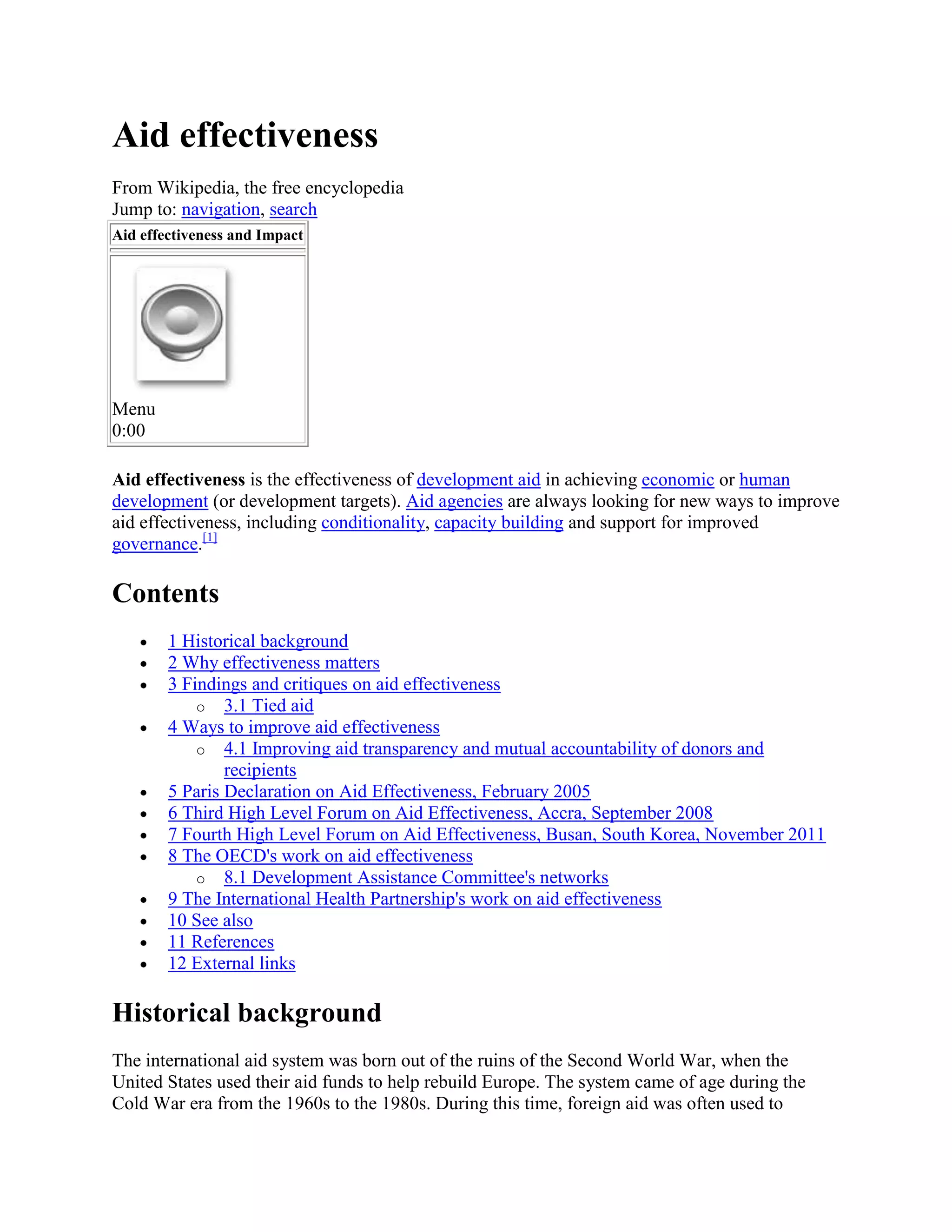 Aid effectiveness refers to how effectively development aid achieves economic and human development goals. Over time, aid became fragmented and distributed based on geopolitical goals rather than need. This reduced aid's effectiveness. In recent decades, efforts have sought to improve aid's coordination and alignment with developing countries' priorities through agreements like the Paris Declaration. However, fully implementing reforms to make aid more effective based on country ownership and systems remains a ongoing challenge.