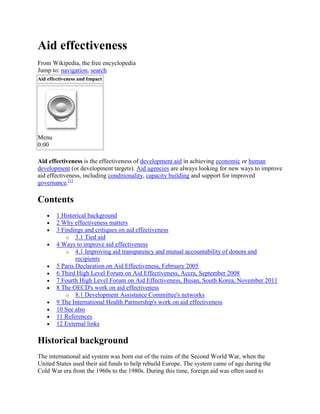Aid effectiveness refers to how effectively development aid achieves economic and human development goals. Over time, aid became fragmented and distributed based on geopolitical goals rather than need. This reduced aid's effectiveness. In recent decades, efforts have sought to improve aid's coordination and alignment with developing countries' priorities through agreements like the Paris Declaration. However, fully implementing reforms to make aid more effective based on country ownership and systems remains a ongoing challenge.