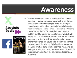 The document describes the AIDA model for marketing campaigns. It discusses using various media platforms like radio, social media, magazines, and competitions to create awareness of a new film. It suggests updating social media with news and behind-the-scenes content to generate interest. Adding specific details like the film's release date can help develop desire among the audience. Providing extensive information allows the audience to take action by purchasing tickets to see the film.