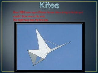 A Chinese farmer tied string to his hat around 2000 years ago, which may have been the first recorded kite. The Montgolfier brothers launched the first hot air balloon in 1783, first sending farm animals aloft and later becoming the first humans to fly in a hot air balloon over Paris. This document provides basic instructions for building and flying a simple glider.