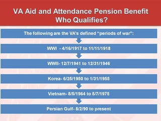 The document summarizes Aid & Attendance, a financial benefit program administered by the Department of Veterans Affairs (VA) that provides additional monthly pension payments to eligible war-time veterans and surviving spouses to help cover costs of assisted living, home care, or nursing home care. To qualify, a veteran must have served 90 days active duty including at least one day during a recognized war period, be receiving care for a non-service related disability or be over 65, and have medical expenses equal to or exceeding their income. Surviving spouses of veterans who were married at least one year prior to the veteran's death may also qualify. The document provides details on eligibility requirements and how to apply for the benefit.