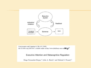 Il documento analizza le funzioni esecutive e le loro misurazioni, evidenziando l'evoluzione del concetto da funzioni frontali a funzioni esecutive e i modelli teorici associati. Viene discusso come l'attenzione interagisca con i processi esecutivi e come le emozioni influenzino il controllo cognitivo, sottolineando l'importanza dell'autoregolazione nel comportamento. Infine, si rileva la difficoltà di misurare in modo accurato le funzioni esecutive a causa della complessità e della variabilità dei costrutti coinvolti.