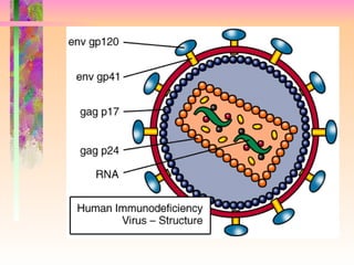 The document discusses AIDS/HIV, including its definition, etiology, epidemiology, pathogenesis, clinical manifestations, diagnosis, treatment, and prevention. It describes HIV's target cells (CD4+ T lymphocytes), its various stages from initial infection to AIDS, common opportunistic infections associated with AIDS like Pneumocystis carinii pneumonia treated with pentamidine, and combination antiretroviral therapy.